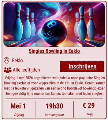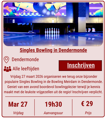 Bij Will You Date Me kan je terecht voor een ruime waaier aan singles activiteiten. Zo organiseren we niet alleen mooie stads- en natuurwandelingen voor singles, daarnaast zijn er ook onze razend populaire Singles Bowlings. Verder is het zo dat we ook op regelmatige basis interessante bezoeken aan belangrijke monumenten organiseren en kan je deelnemen aan prachtige daguitstappen. Wil je graag op de hoogte blijven van alle verschillende activiteiten voor singles die wij maandelijks organiseren? Vergeet dan zeker niet om ons te volgen op Facebook en / of schrijf je in voor onze gratis nieuwsbrief! Heb je zelf ook een leuk voorstel voor een singles activiteit? Dan spreekt het voor zich dat je ons ook daar altijd voor kan contacteren!