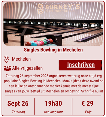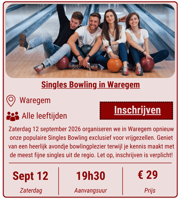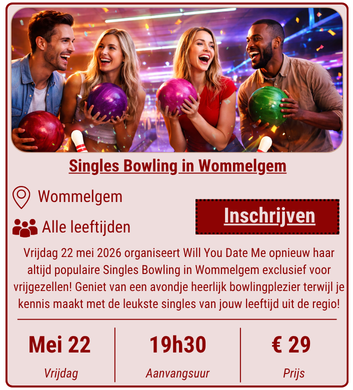 Bij Will You Date Me kan je terecht voor een ruime waaier aan singles activiteiten. Zo organiseren we niet alleen mooie stads- en natuurwandelingen voor singles, daarnaast zijn er ook onze razend populaire Singles Bowlings. Verder is het zo dat we ook op regelmatige basis interessante bezoeken aan belangrijke monumenten organiseren en kan je deelnemen aan prachtige daguitstappen. Wil je graag op de hoogte blijven van alle verschillende activiteiten voor singles die wij maandelijks organiseren? Vergeet dan zeker niet om ons te volgen op Facebook en / of schrijf je in voor onze gratis nieuwsbrief! Heb je zelf ook een leuk voorstel voor een singles activiteit? Dan spreekt het voor zich dat je ons ook daar altijd voor kan contacteren!